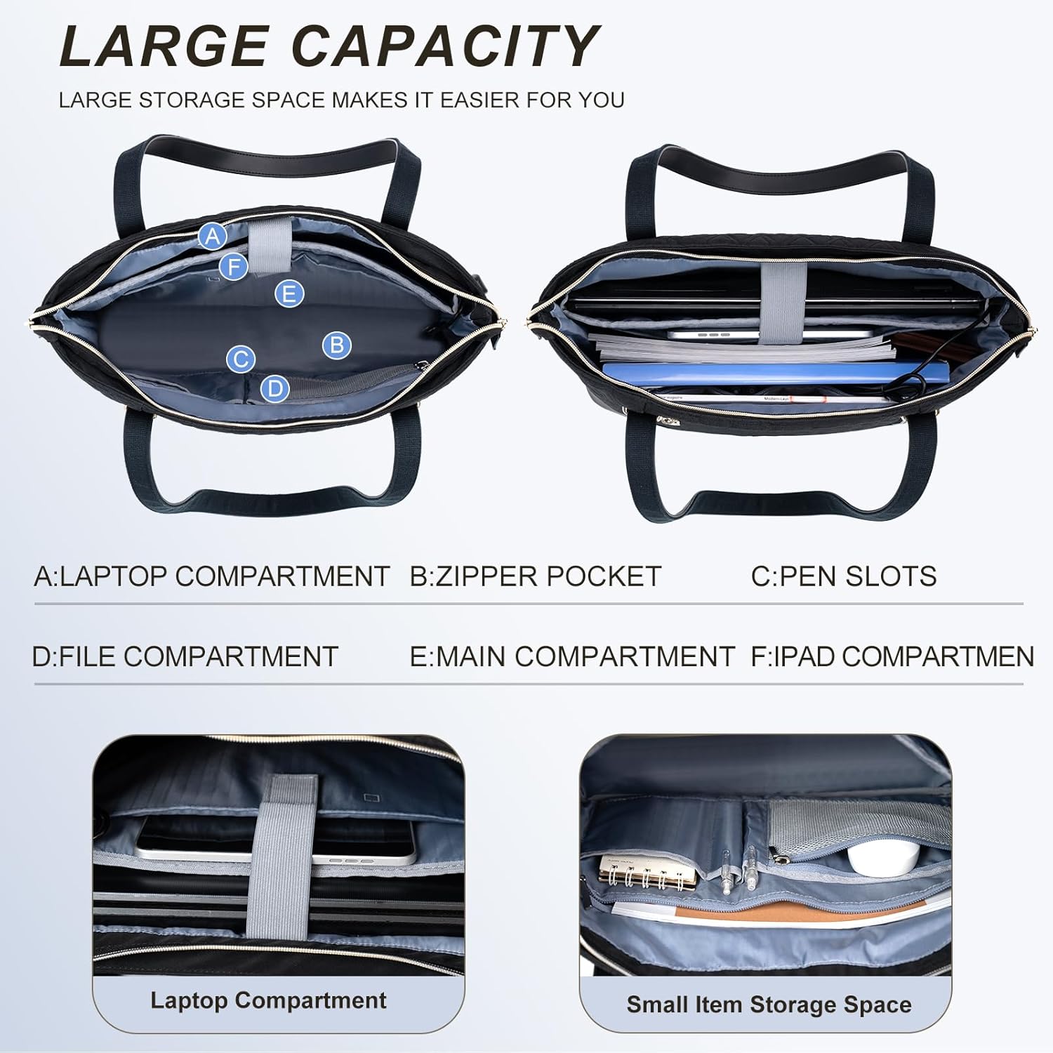 【Large Capacity & Multi-pocket】:The Laptop Tote Bag has multiple pockets, you can place your 14″-16″ laptop, iPad, accessories, cards, and wallet in their right position easily. The padded design protects your laptop from accidental bumps and scratches, and the large opening makes it easier to keep things in your handbag.